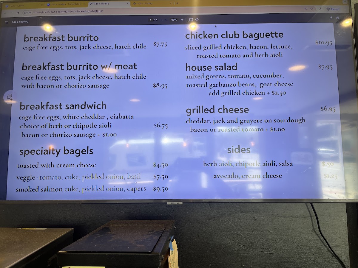 Sides: Complementary items such as Herb Aioli, Chipotle Aioli, Salsa, as well as Avocado and Cream Cheese are offered to accompany food selections.